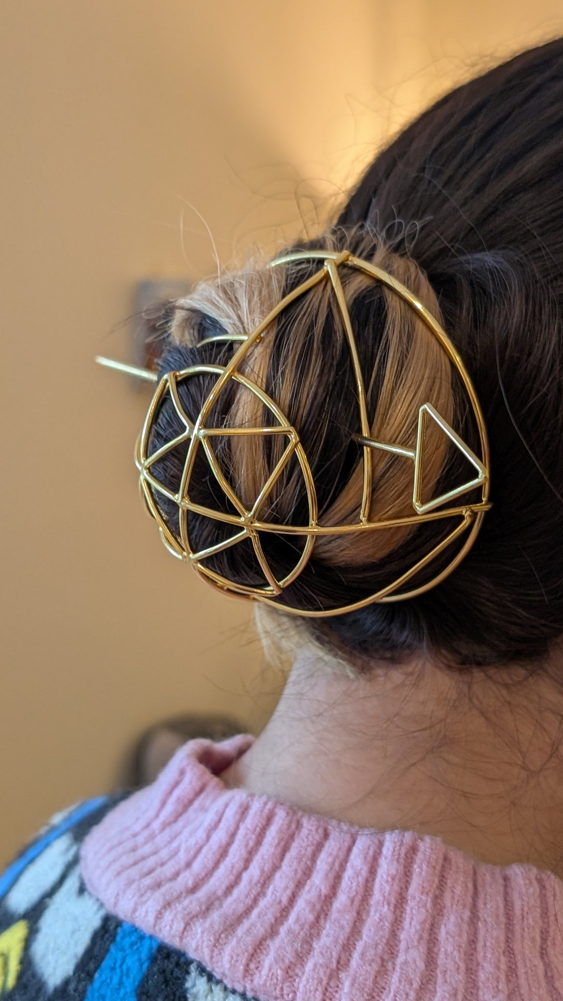 Elegant Gold Hair Bun Pin. This stunning handcrafted hair bun pin is designed to add a regal charm to your hairstyle. Made with polished gold-toned metal, its dome-shaped frame comes with a matching sleek stick pin that slides...Read more