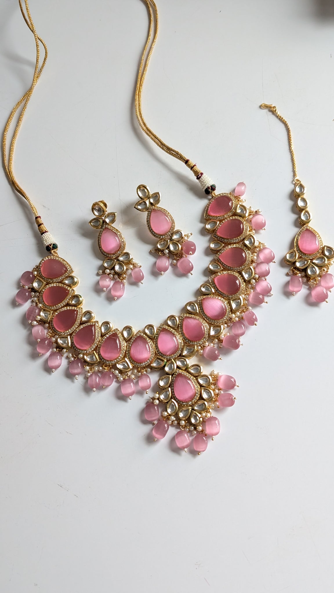 Kundan bridal necklace set with pink and color stones. Comes with matching earrings and mang tikka. The set is gold finish.