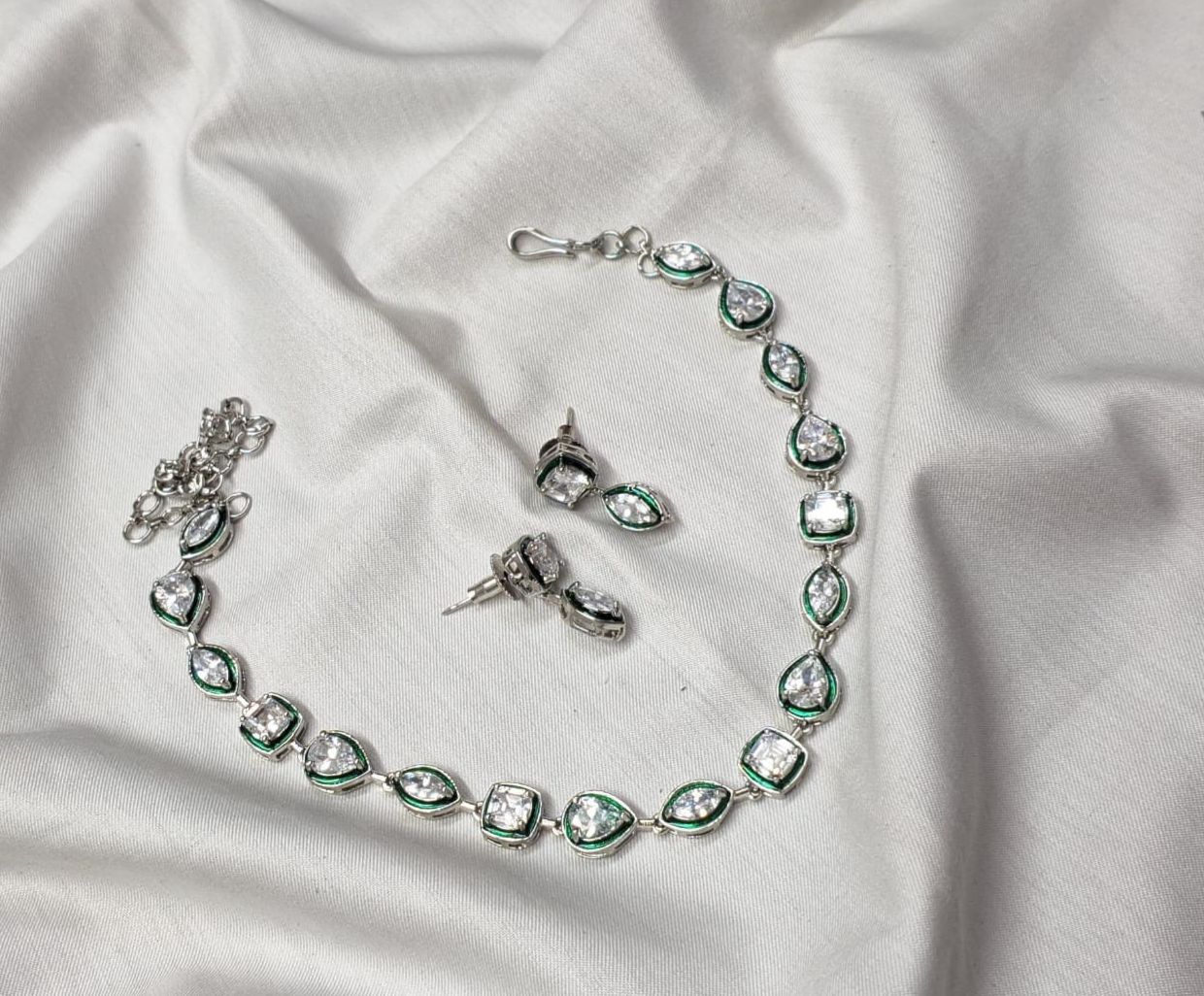 Moissanite Choker with matching earrings. This elegant and sleek Choker Set captures the timeless grace of Alia Bhatt’s understated style. Featuring brilliant Moissanite stones outlined with a delicate emerald-green enamel border, this piece strikes the perfect balance between...Read more