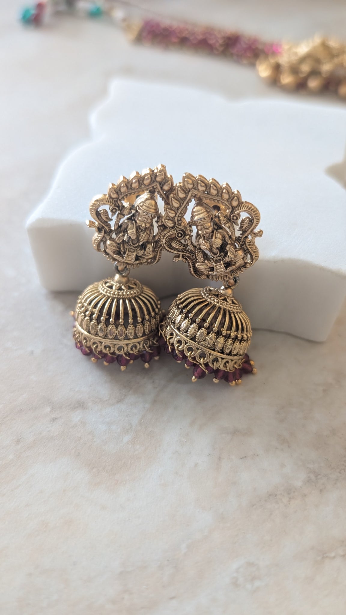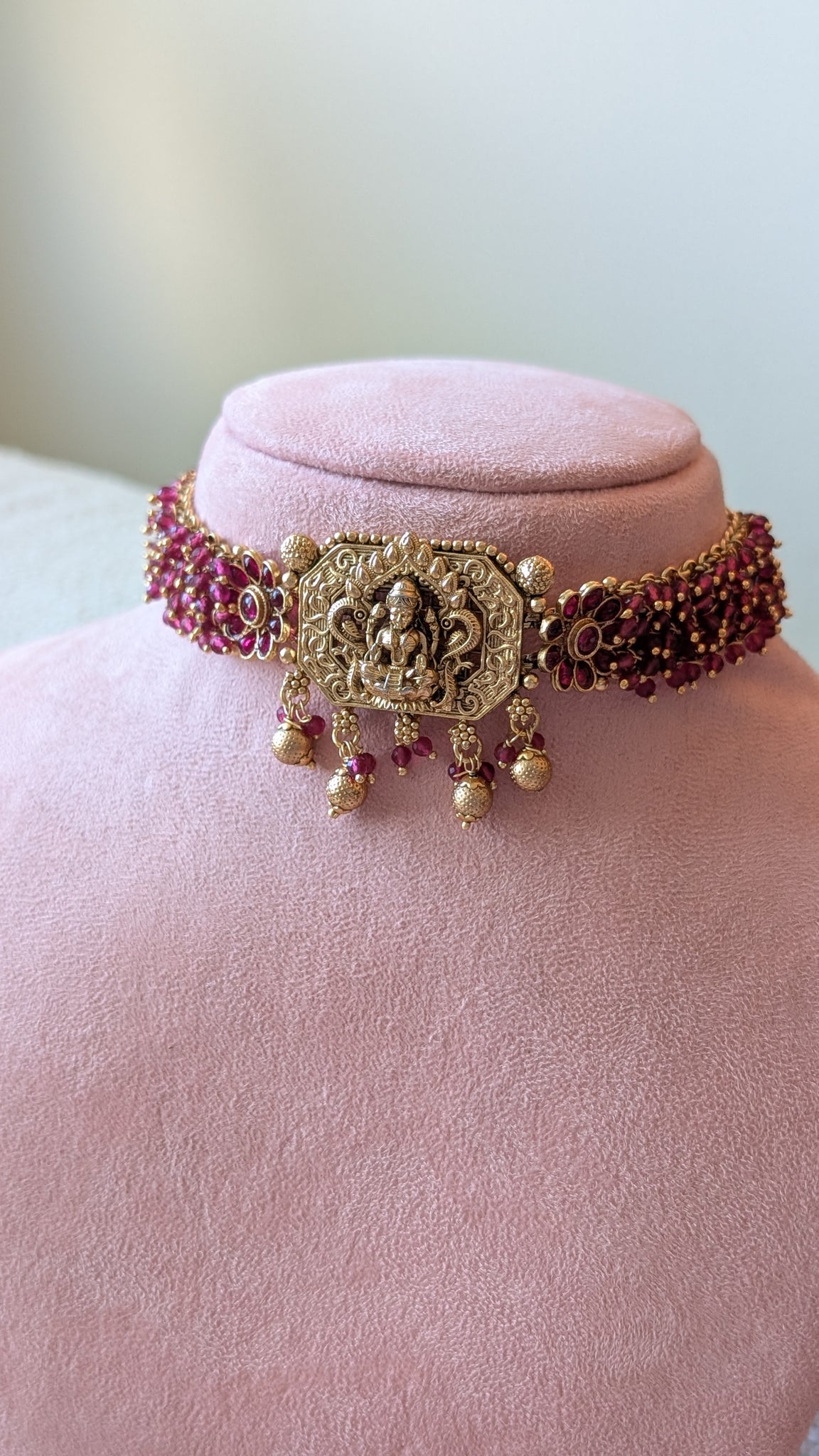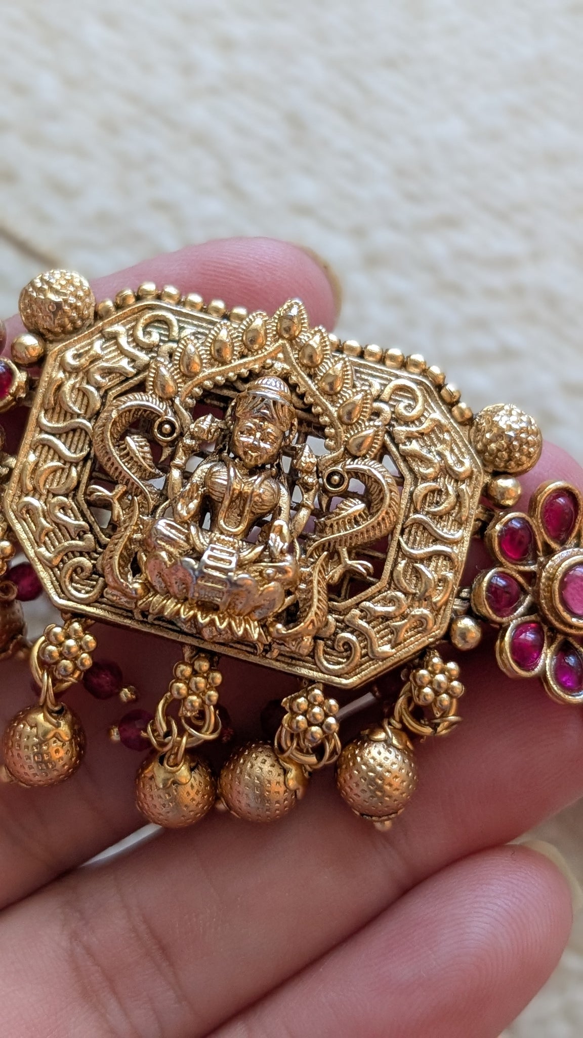 This antique-inspired Lakshmi choker in gold finish is a masterpiece of craftsmanship, paired with matching jhumkas for the complete divine look.