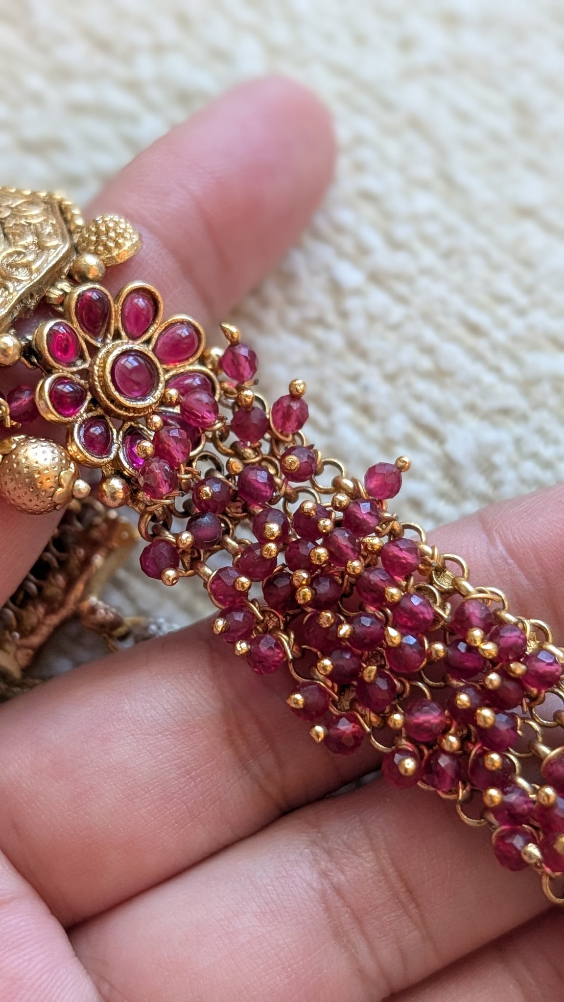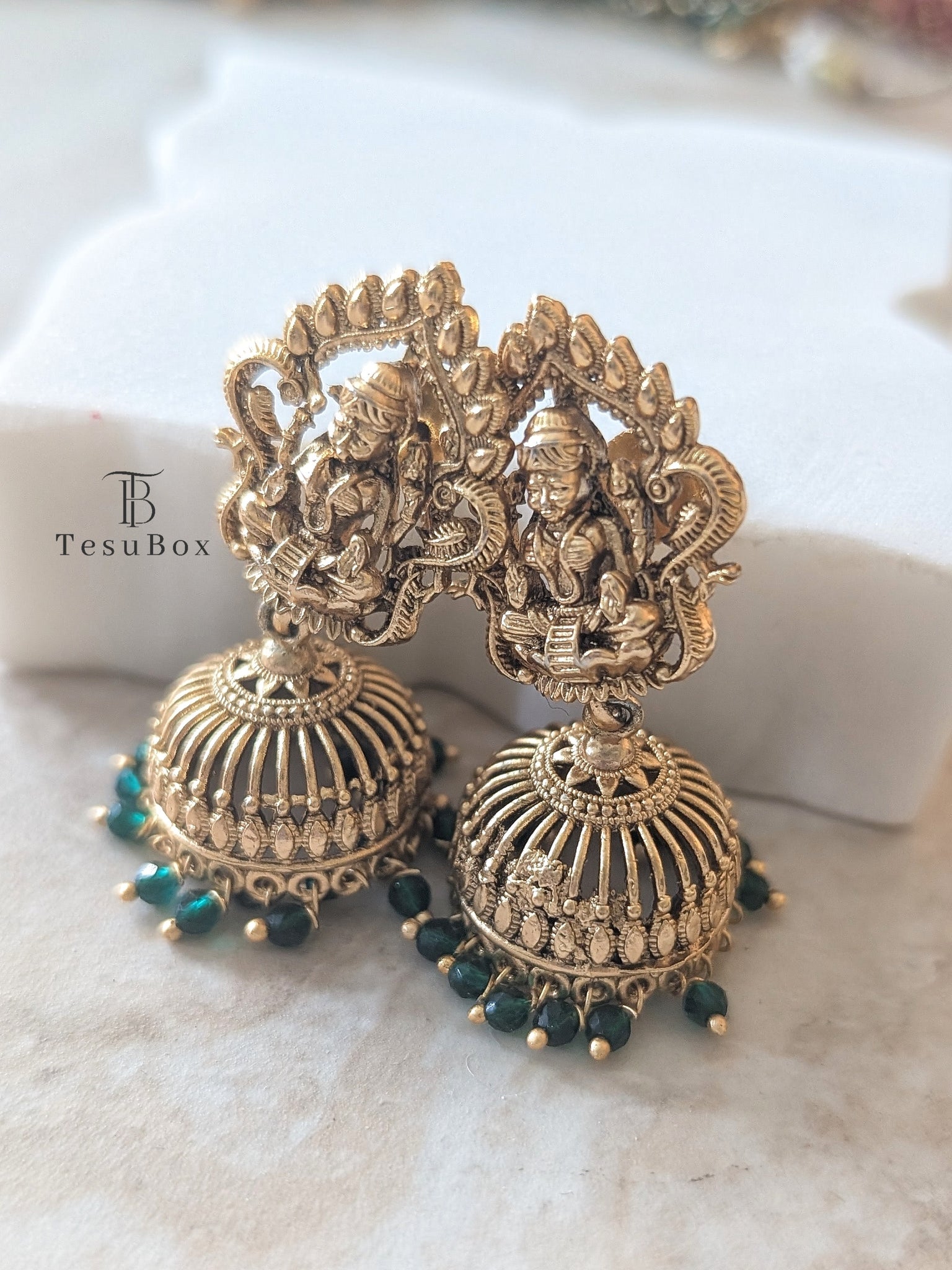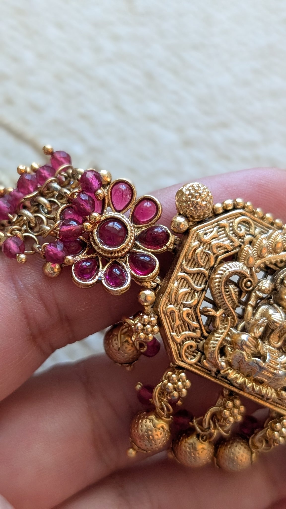 This antique-inspired Lakshmi choker in gold finish is a masterpiece of craftsmanship, paired with matching jhumkas for the complete divine look.
