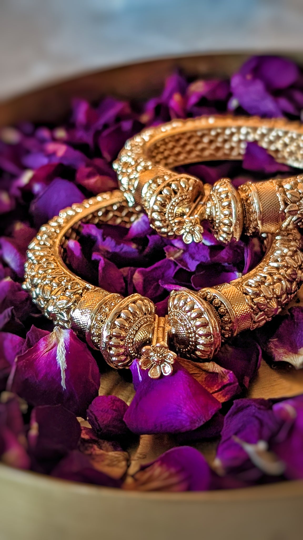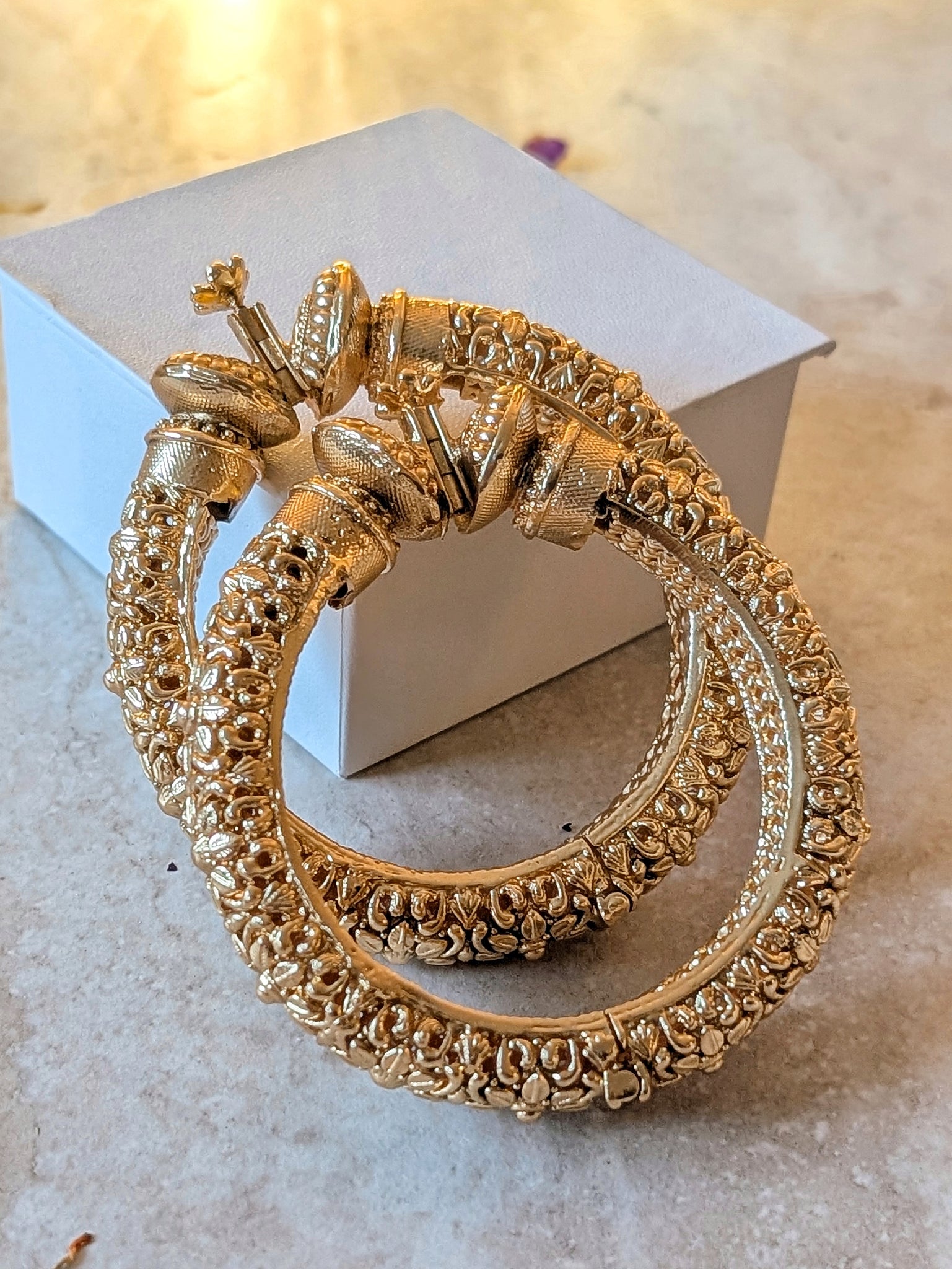 Set of two bangles in gold finish. Gold plated bangles with textured design. The bangles have a screw to open them up. Although these are size 2.4 they can be worn by size 2.6 because they can be...Read more