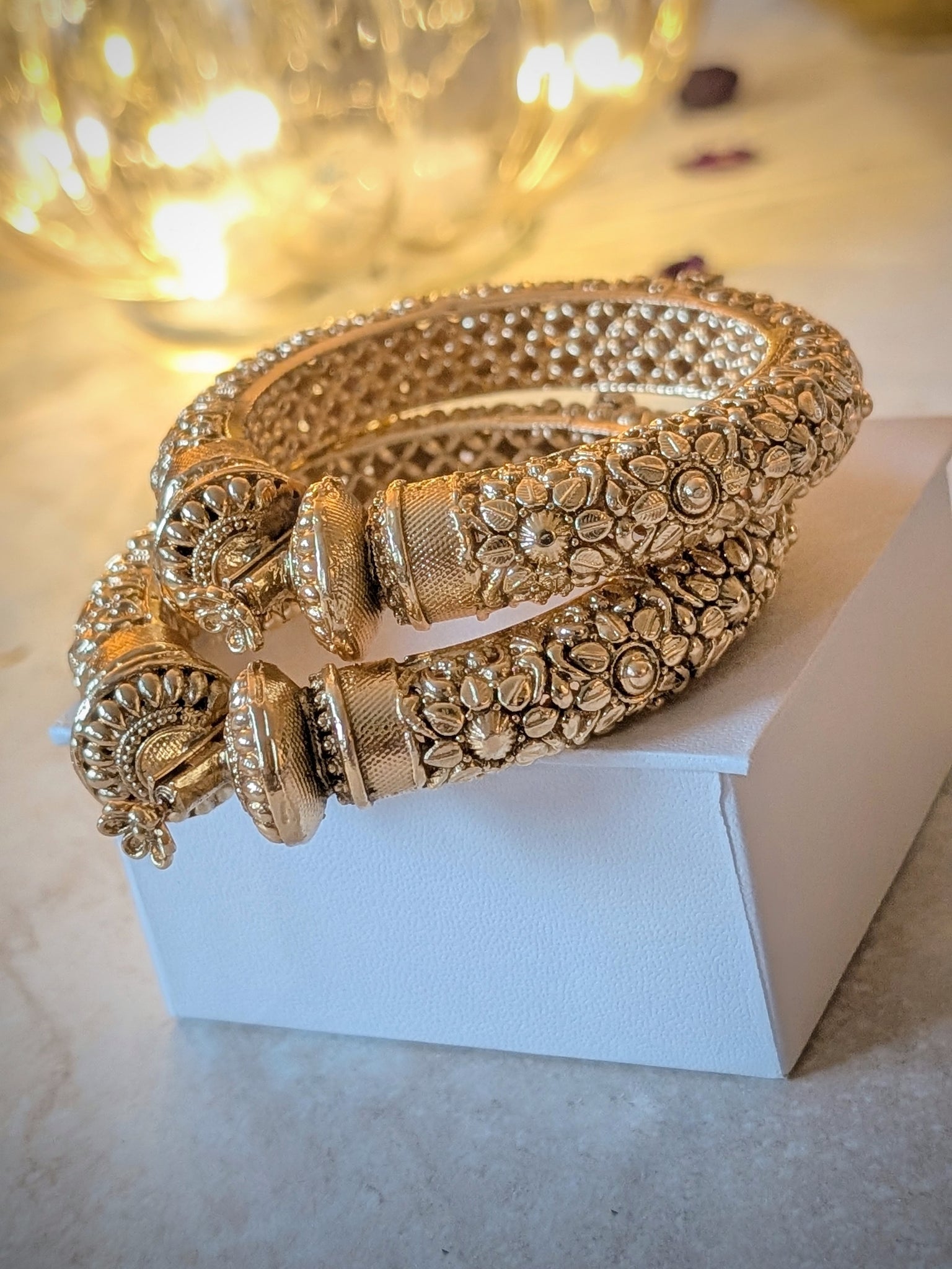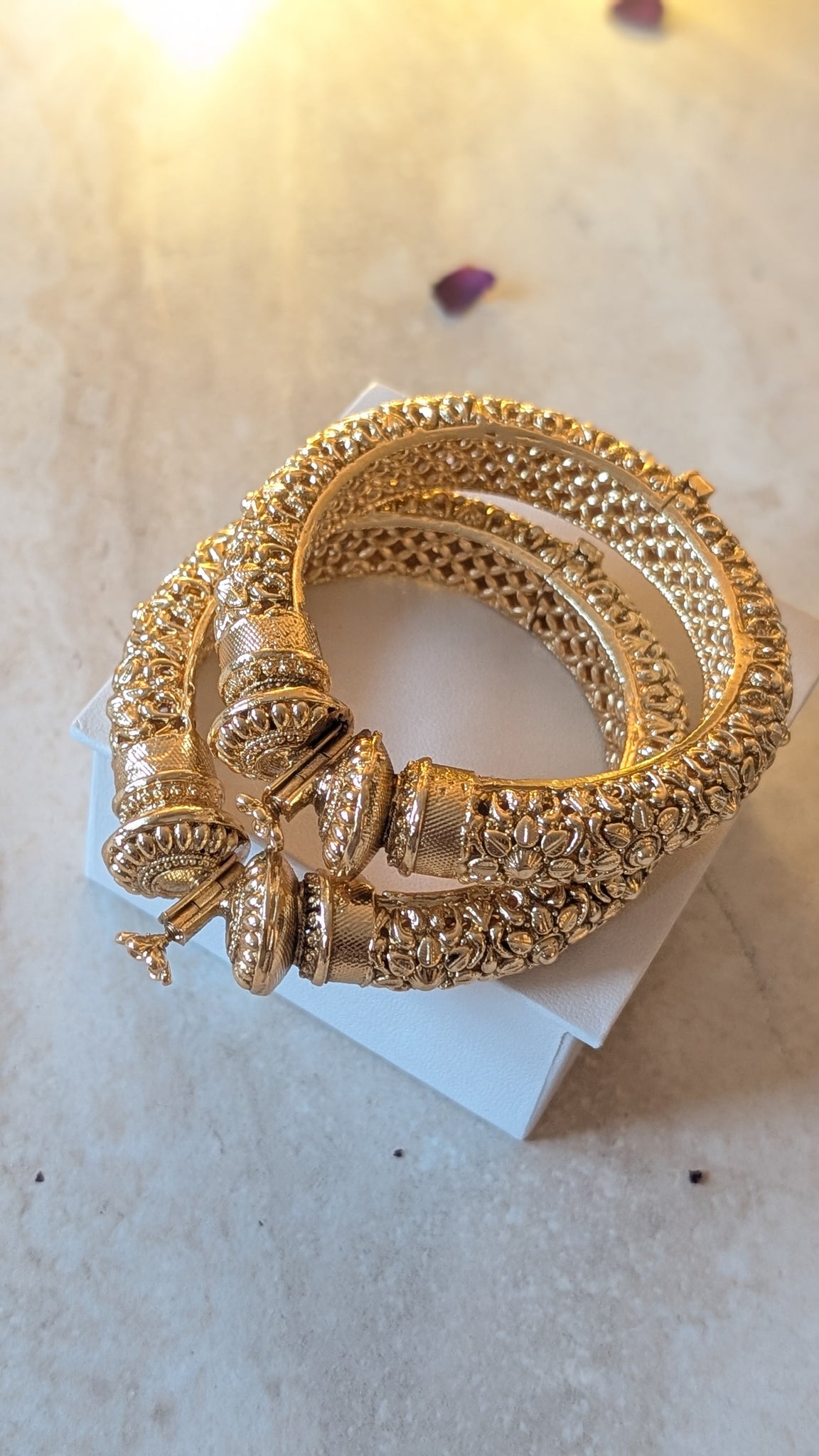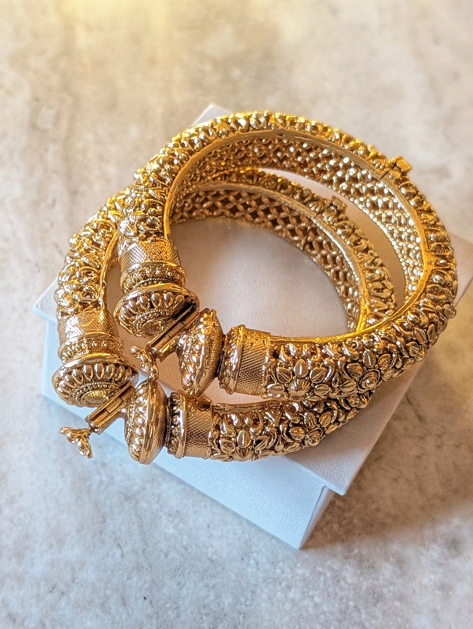 Gold plated bangles with textured design. The bangles have a screw to open them up.
