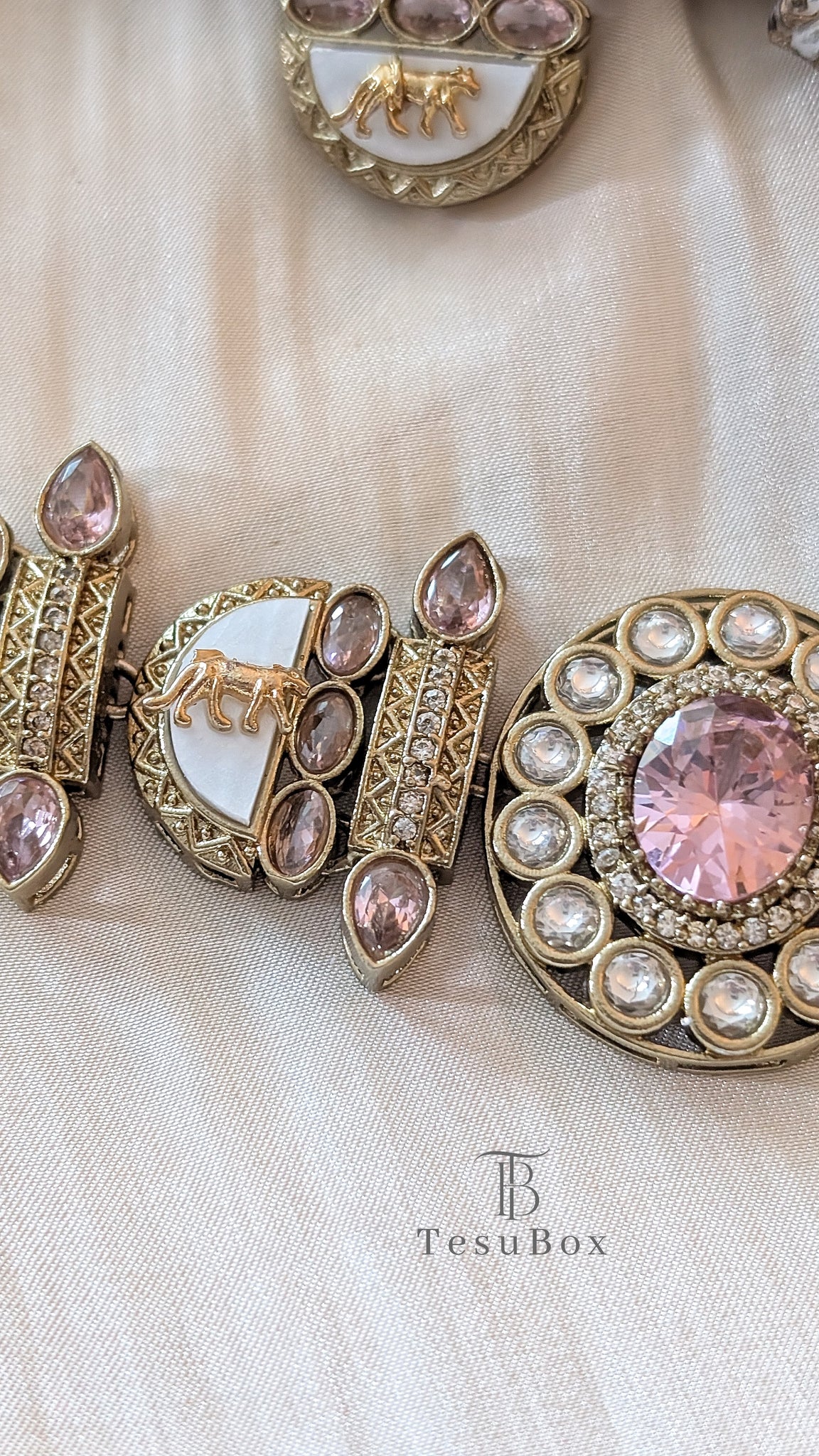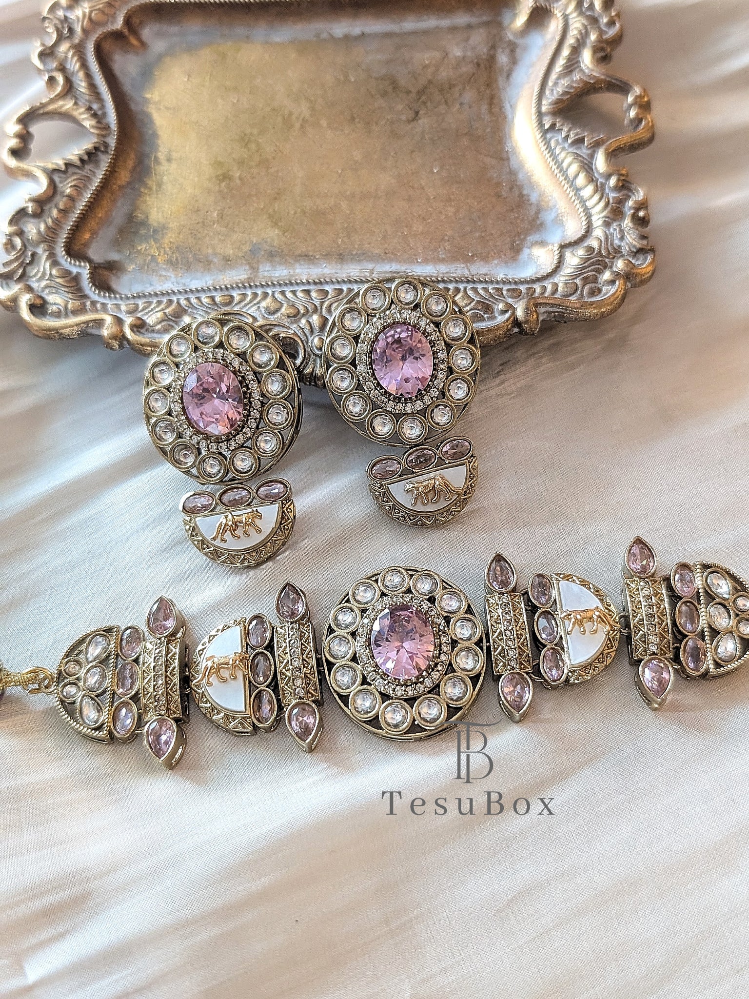 Spice up your accessory game with our new designer inspired choker sets! Lightweight and oh-so-stylish, these beauties feature mother of pearl and stone accents with a fierce Bengal tiger motif.