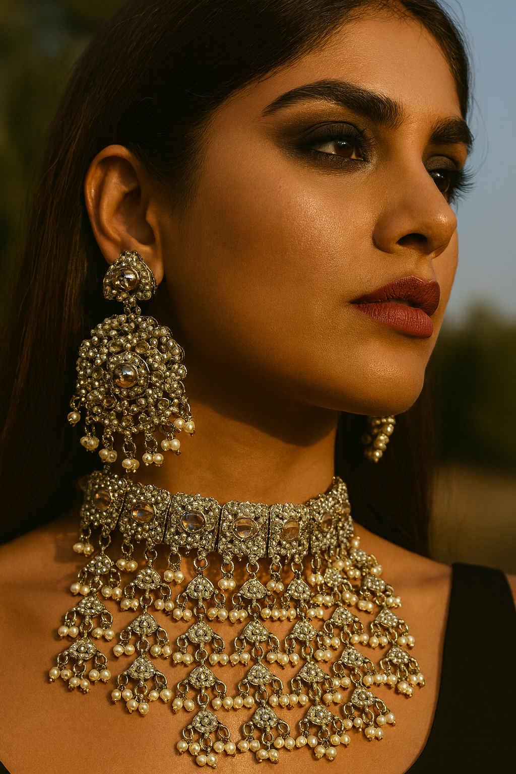 Light weight choker set. Light brown colored Polki stones with off white beads as accents The hanging fringe/accents lend the choker a heavy look without making it look bulky. This is a beautiful neutral set that can work...Read more