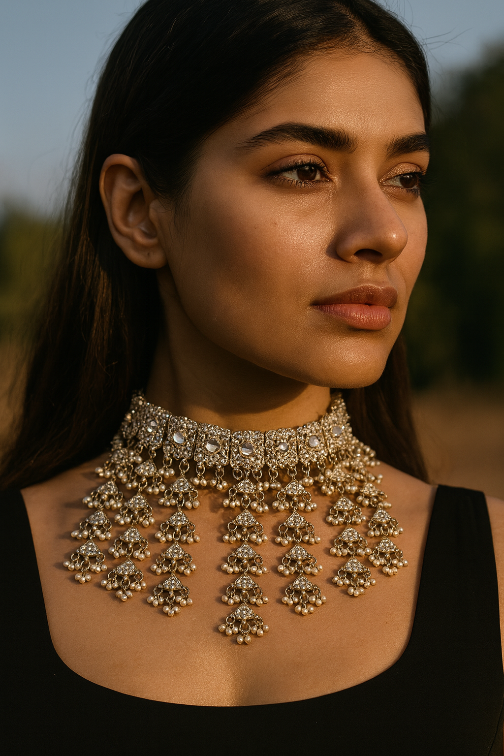 The hanging fringe/accents lend the choker a heavy look without making it look bulky.