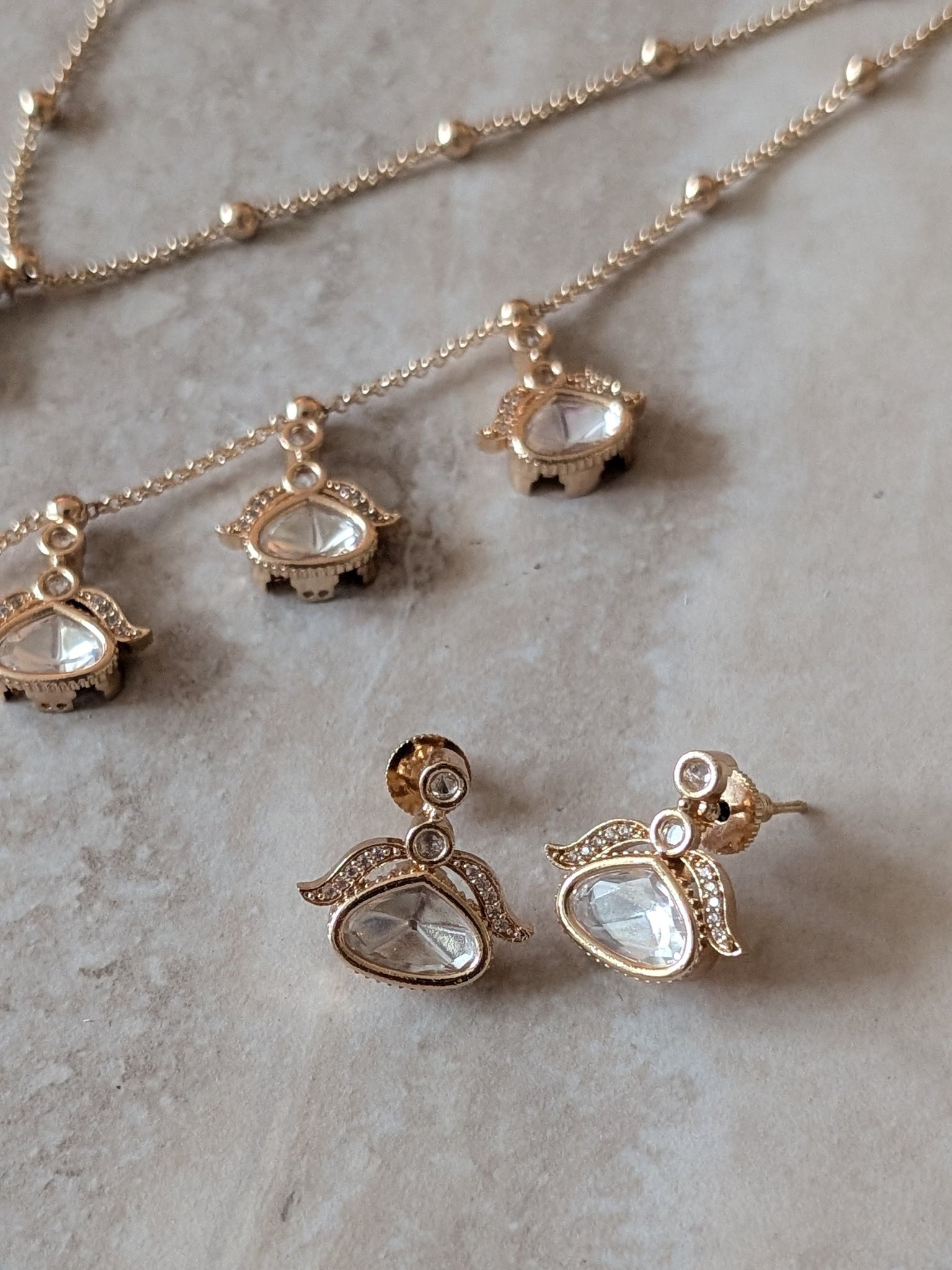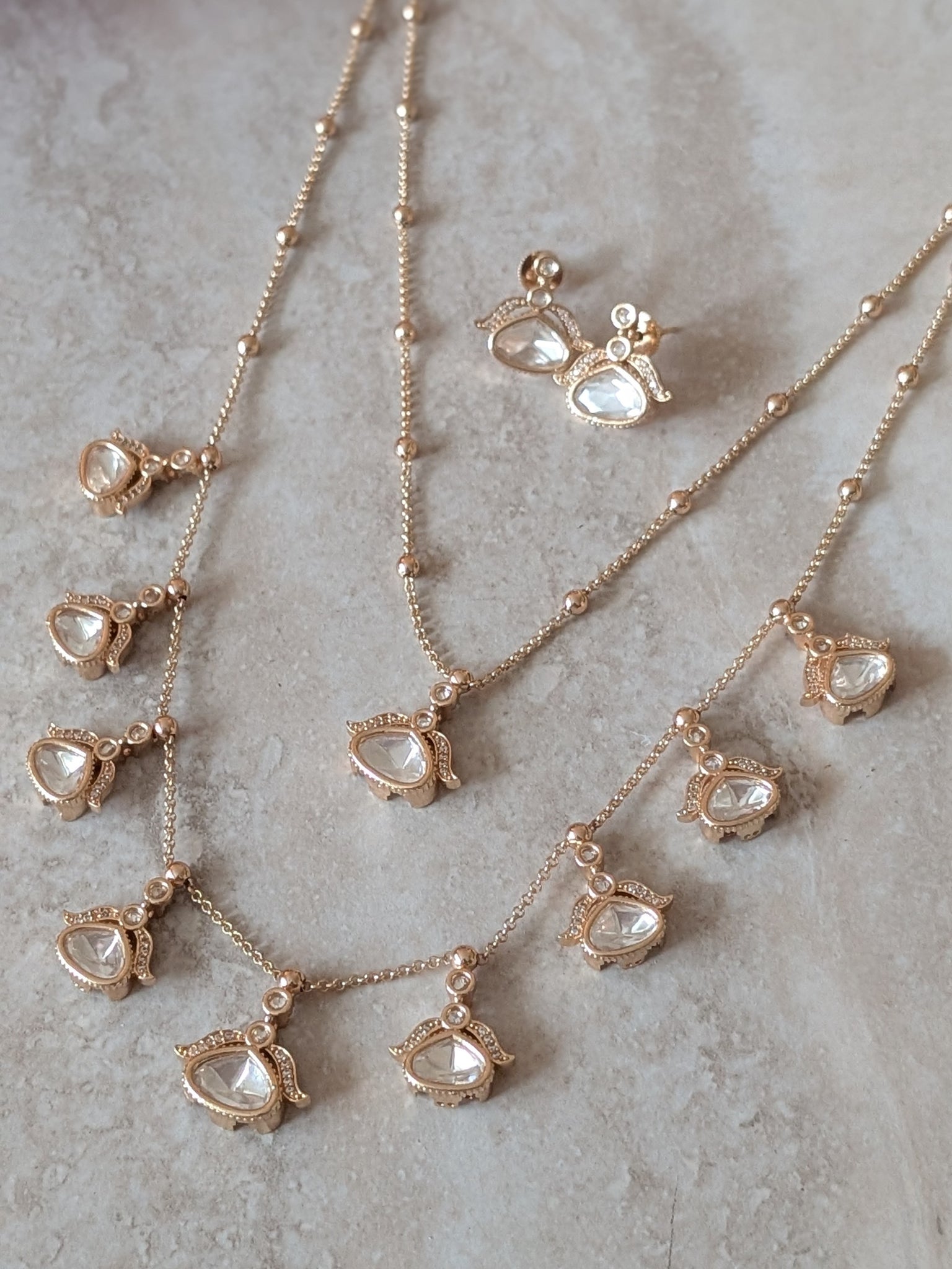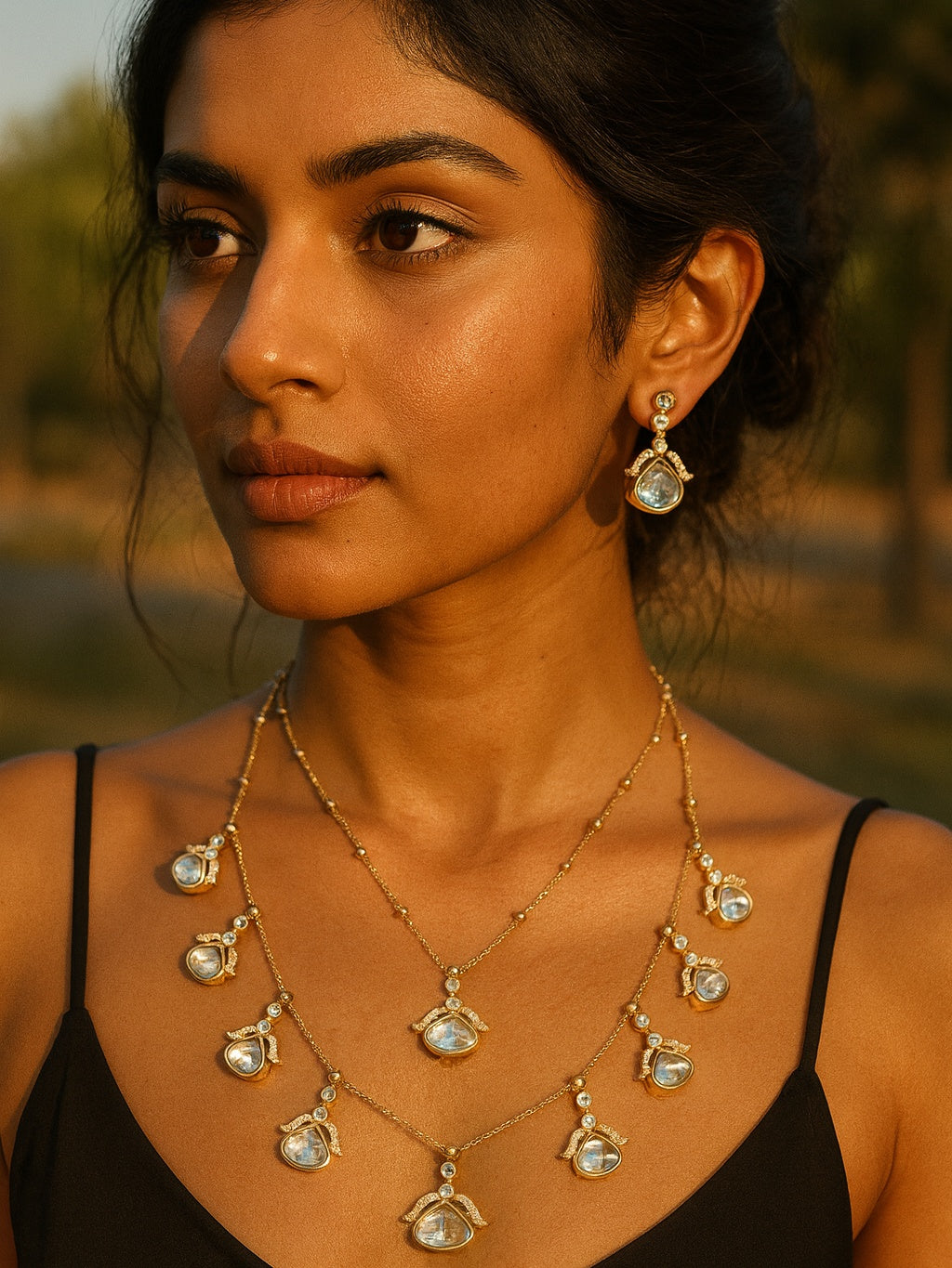Crafted in delicate gold chains, it features layers of cascading pendants, each showcasing a luminous, round-cut stone framed in a golden bezel. The Moissanite stones are accented with sparkling crystal details and delicate embellishments, giving the piece a refined, regal aura.