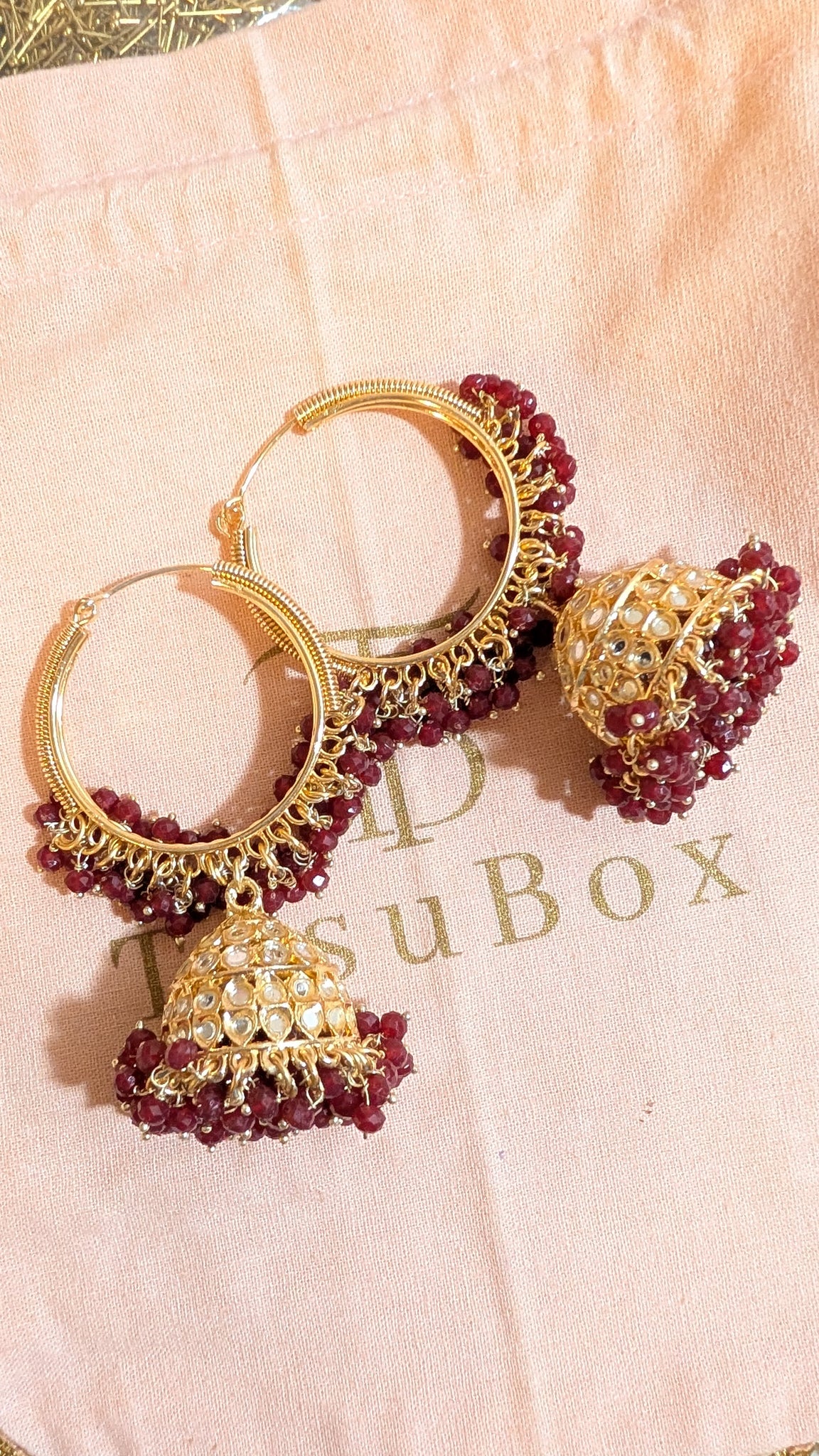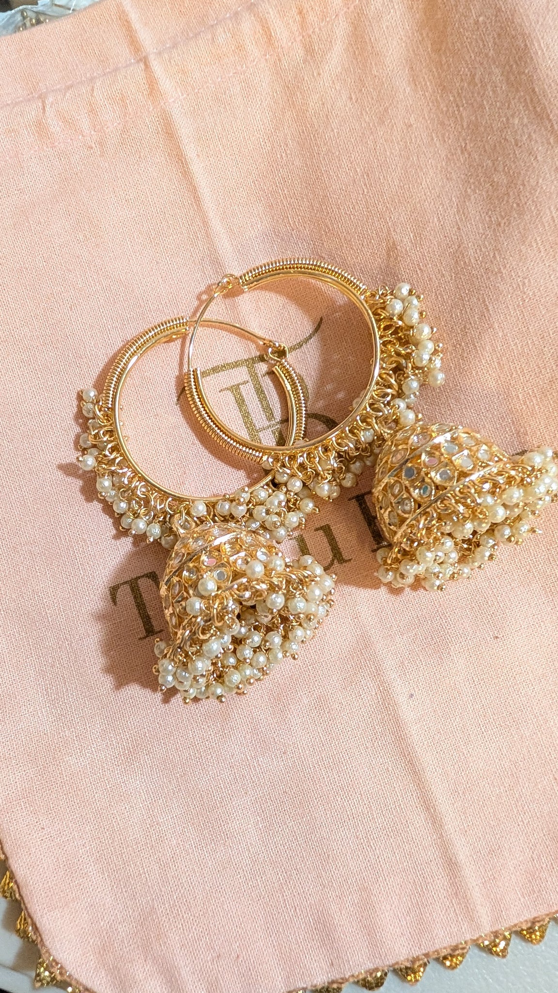 Traditional style mirror jhumka hoop earrings.
