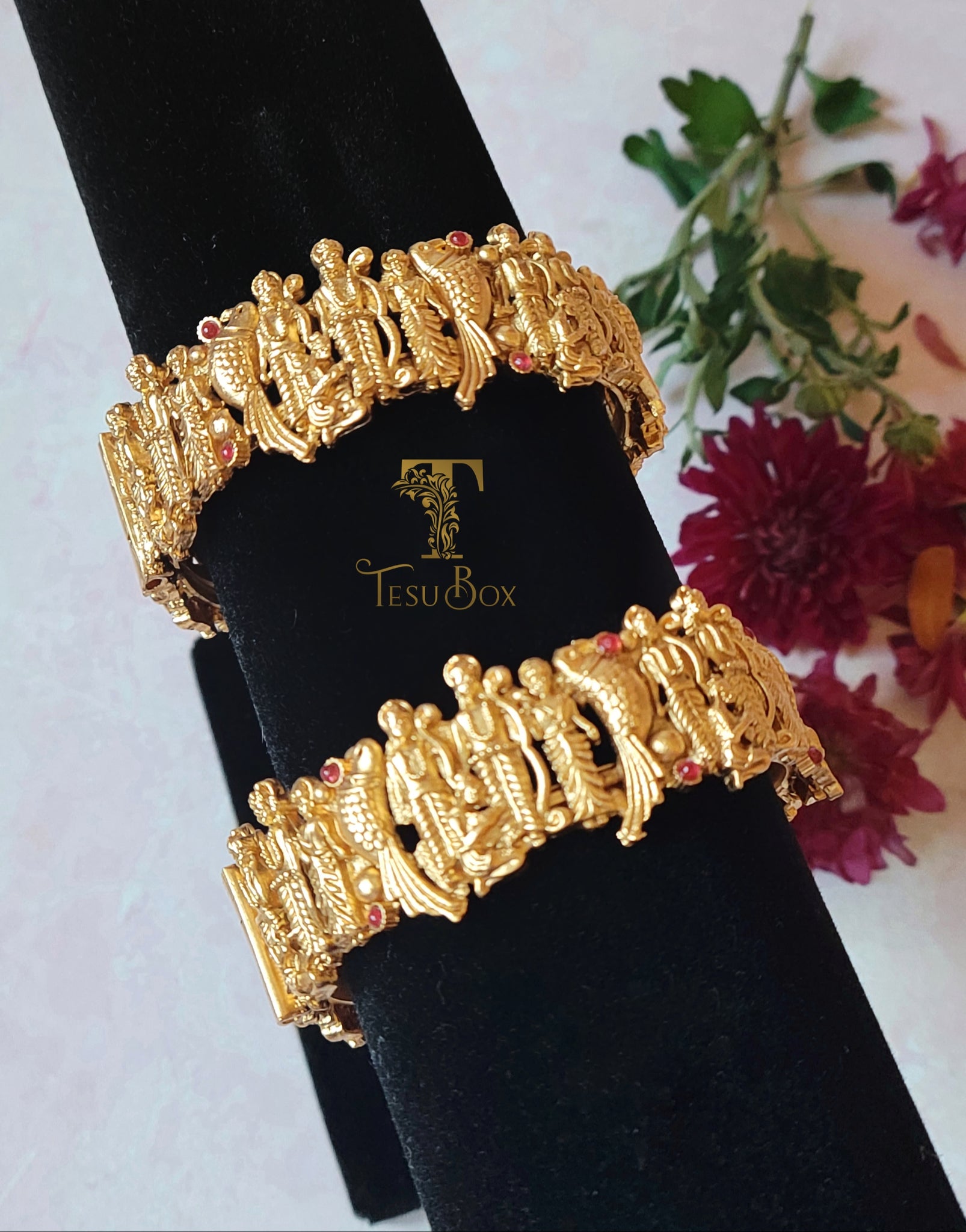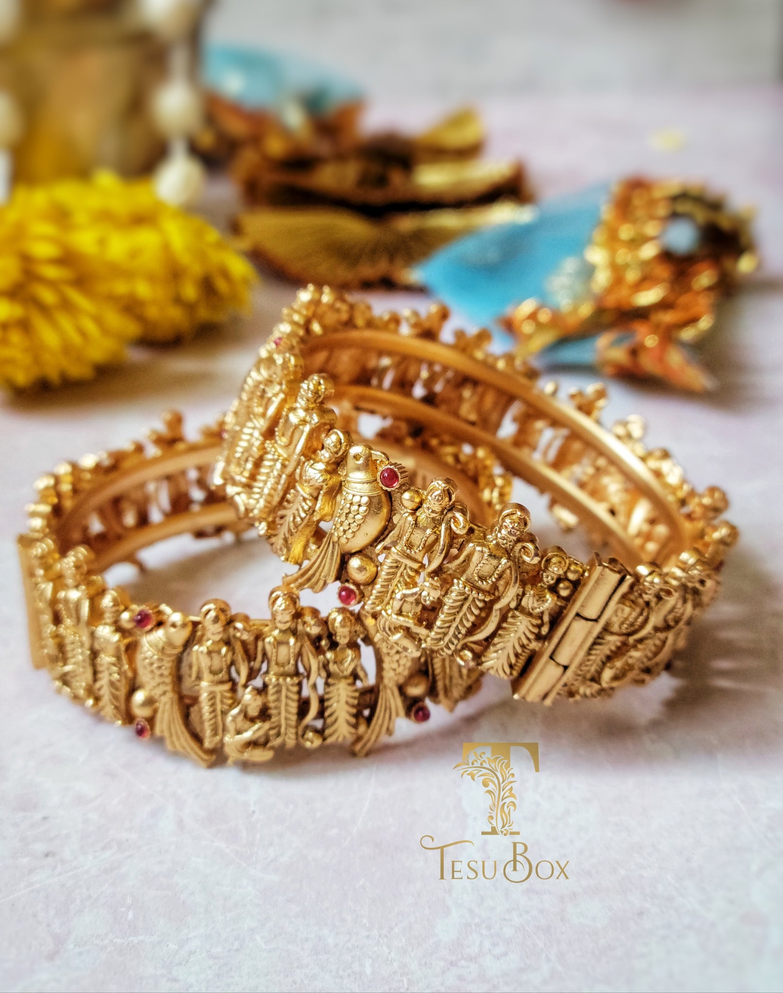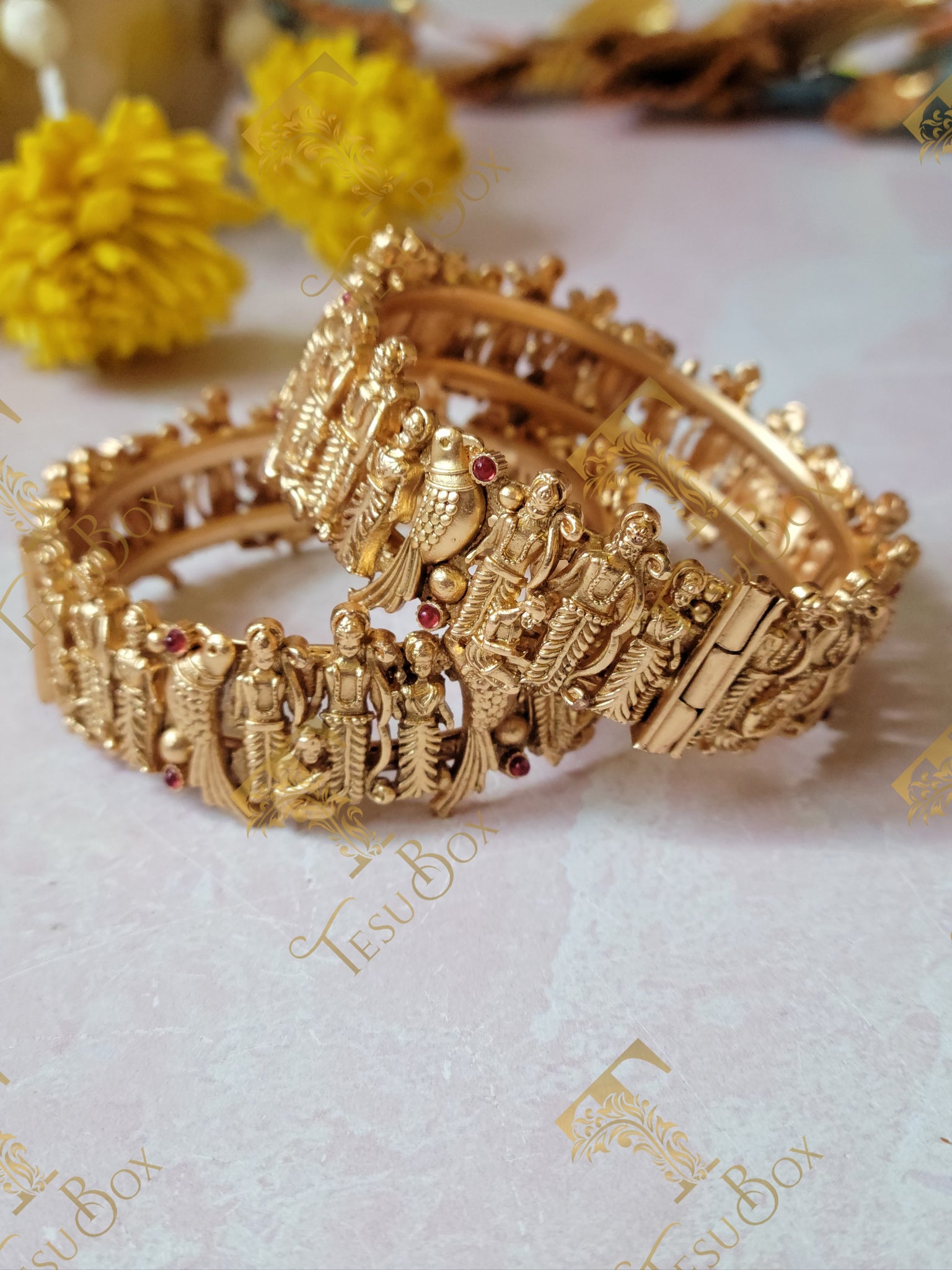 The bracelets have an etching of "Ram Darbar " which includes Lord Ram, Sita, Hanuman.