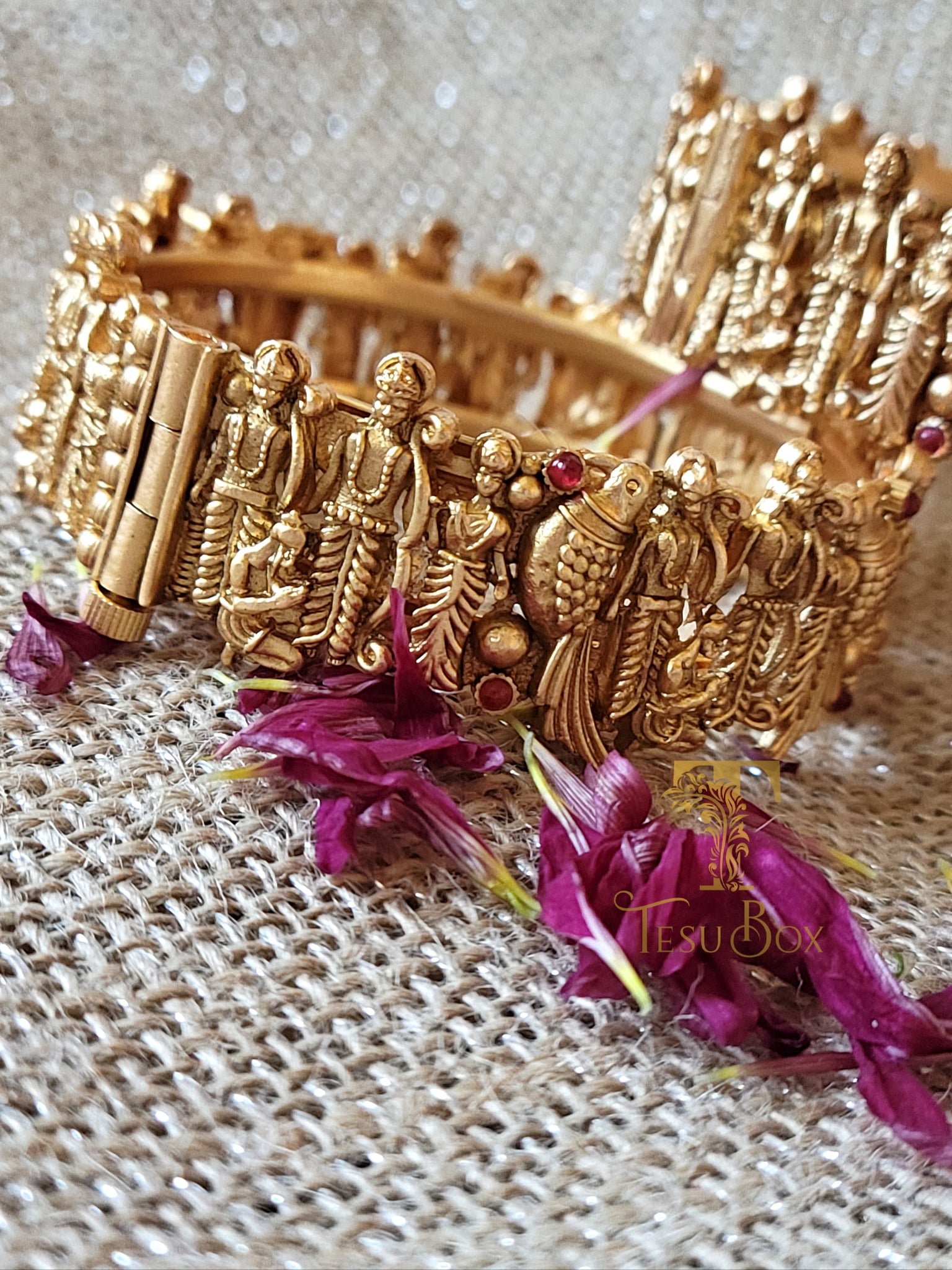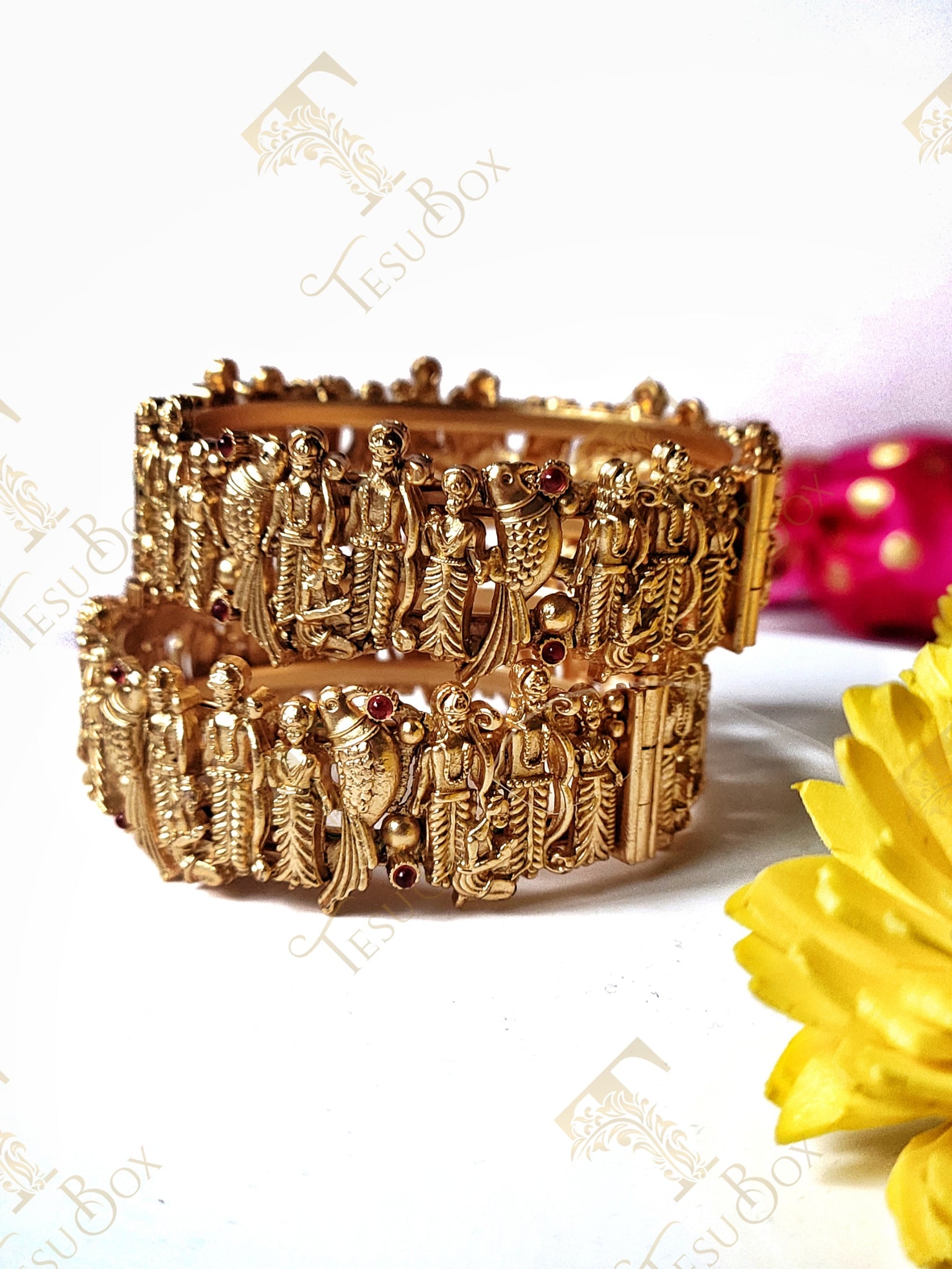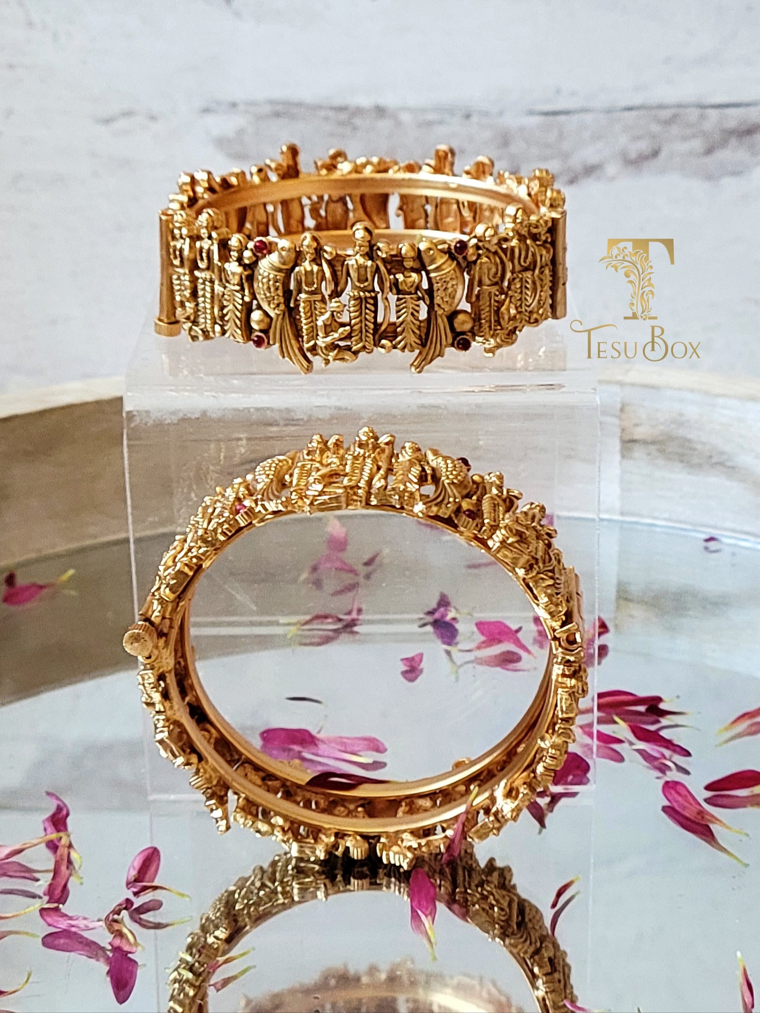 The bracelets have an etching of "Ram Darbar " which includes Lord Ram, Sita, Hanuman.